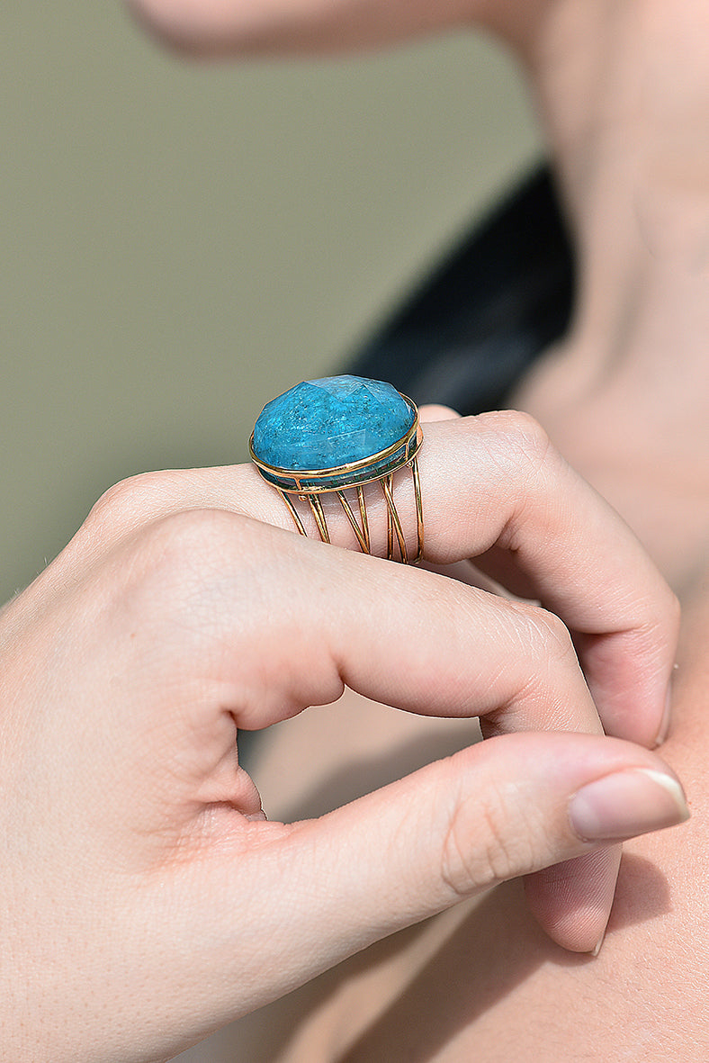 Elegant apatite doublet 24 ø uniquely set in 14K yellow gold, on spiral wire shank.