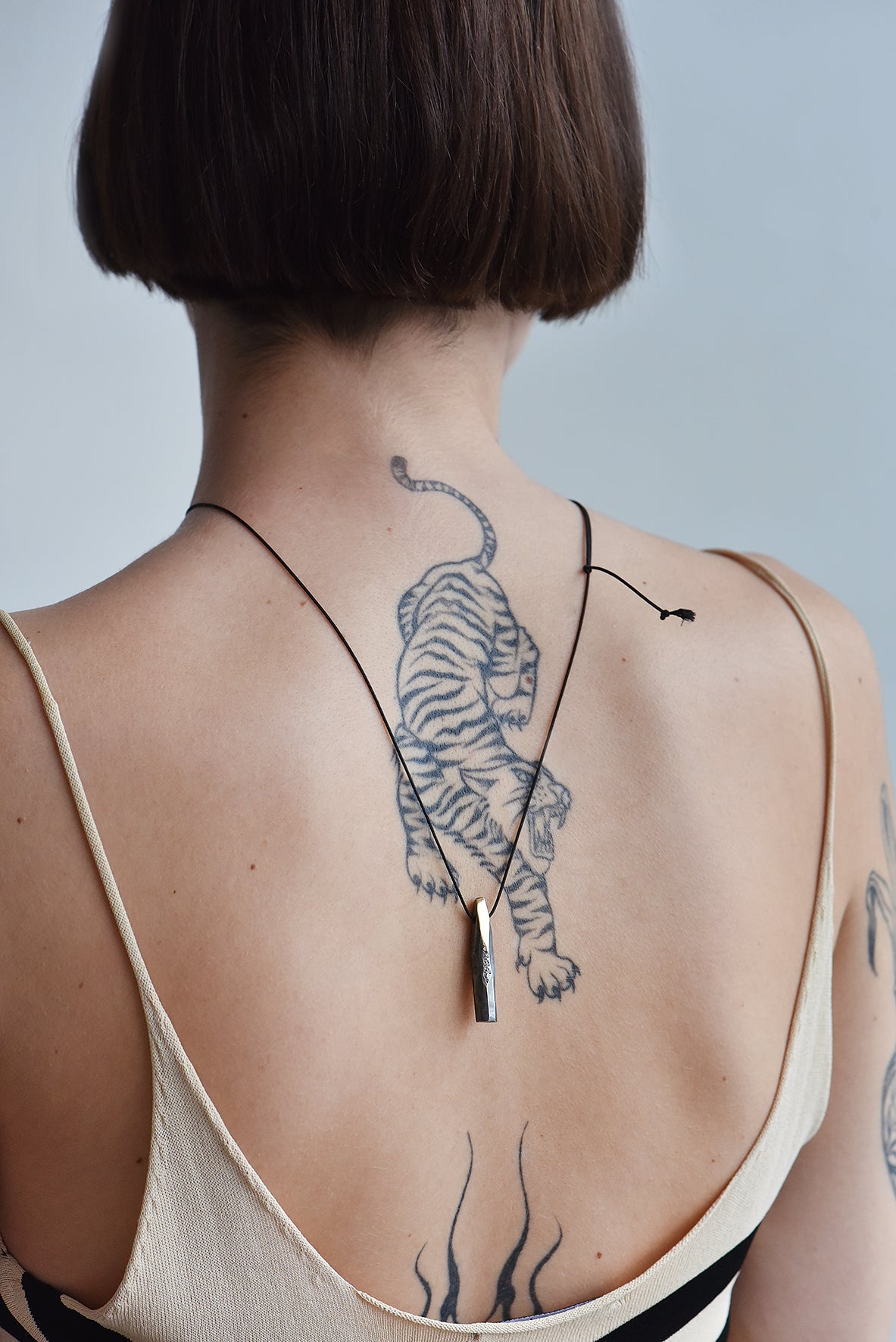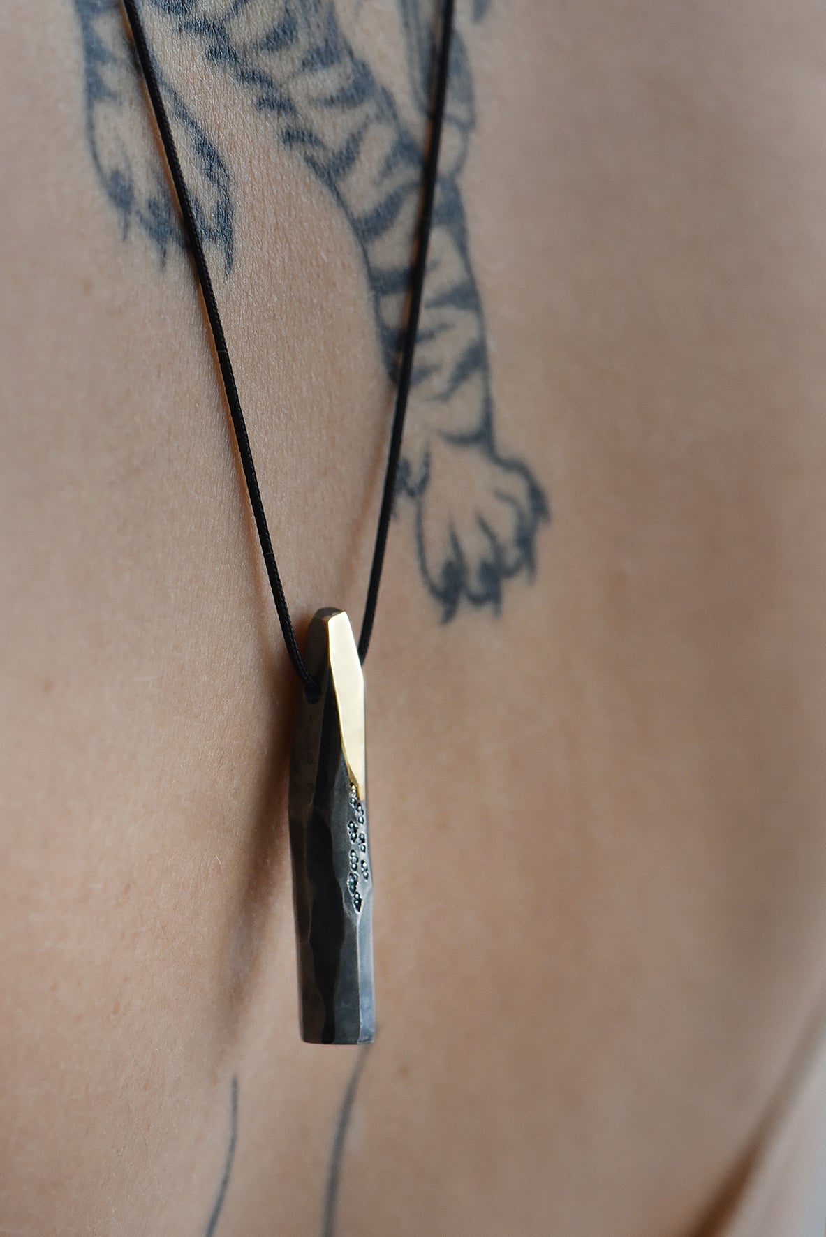 Silver 925 faceted element with a slice of K14 gold and with 7 brown brilliant cut diamonds 0,049ct. tied with black fabric cord.