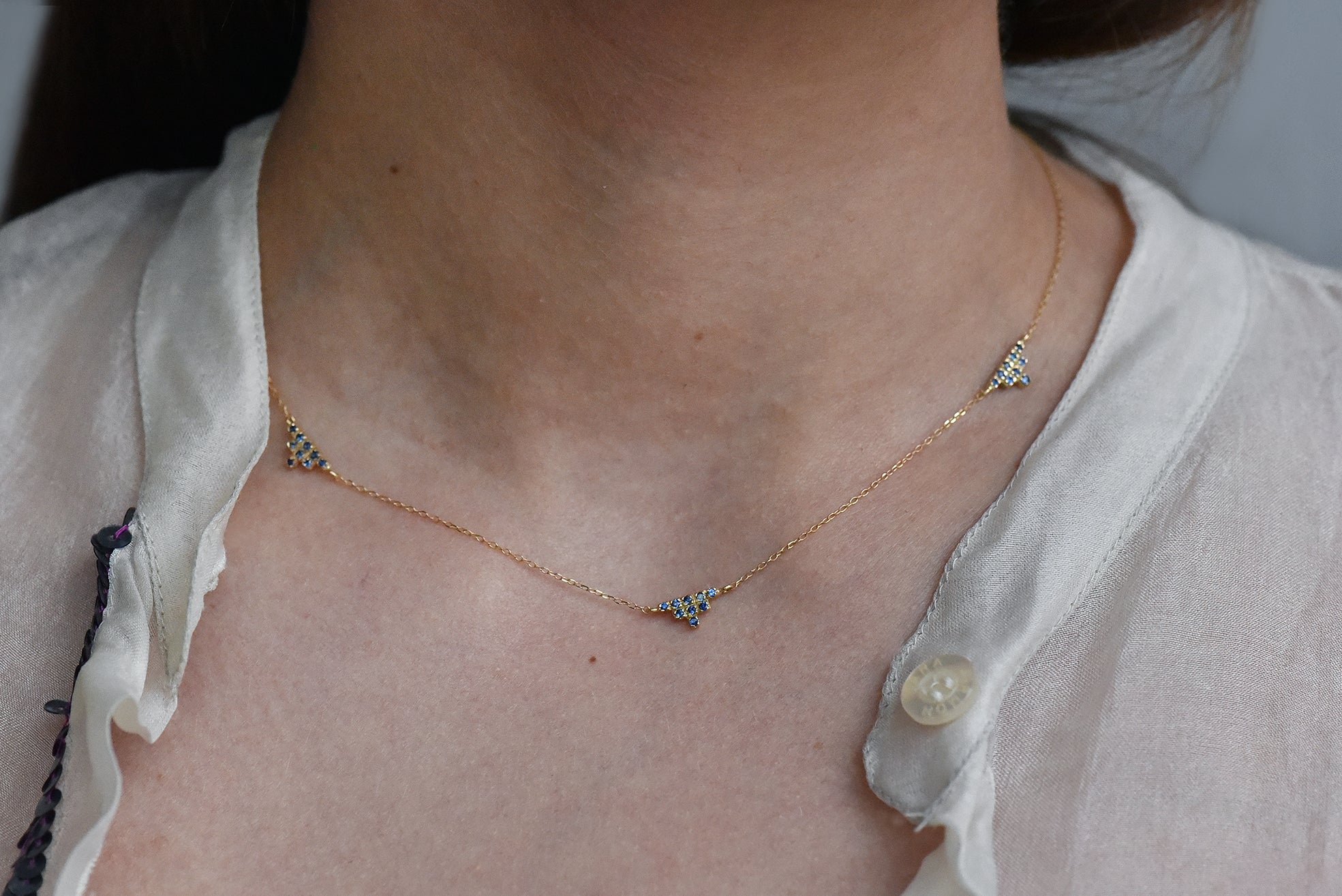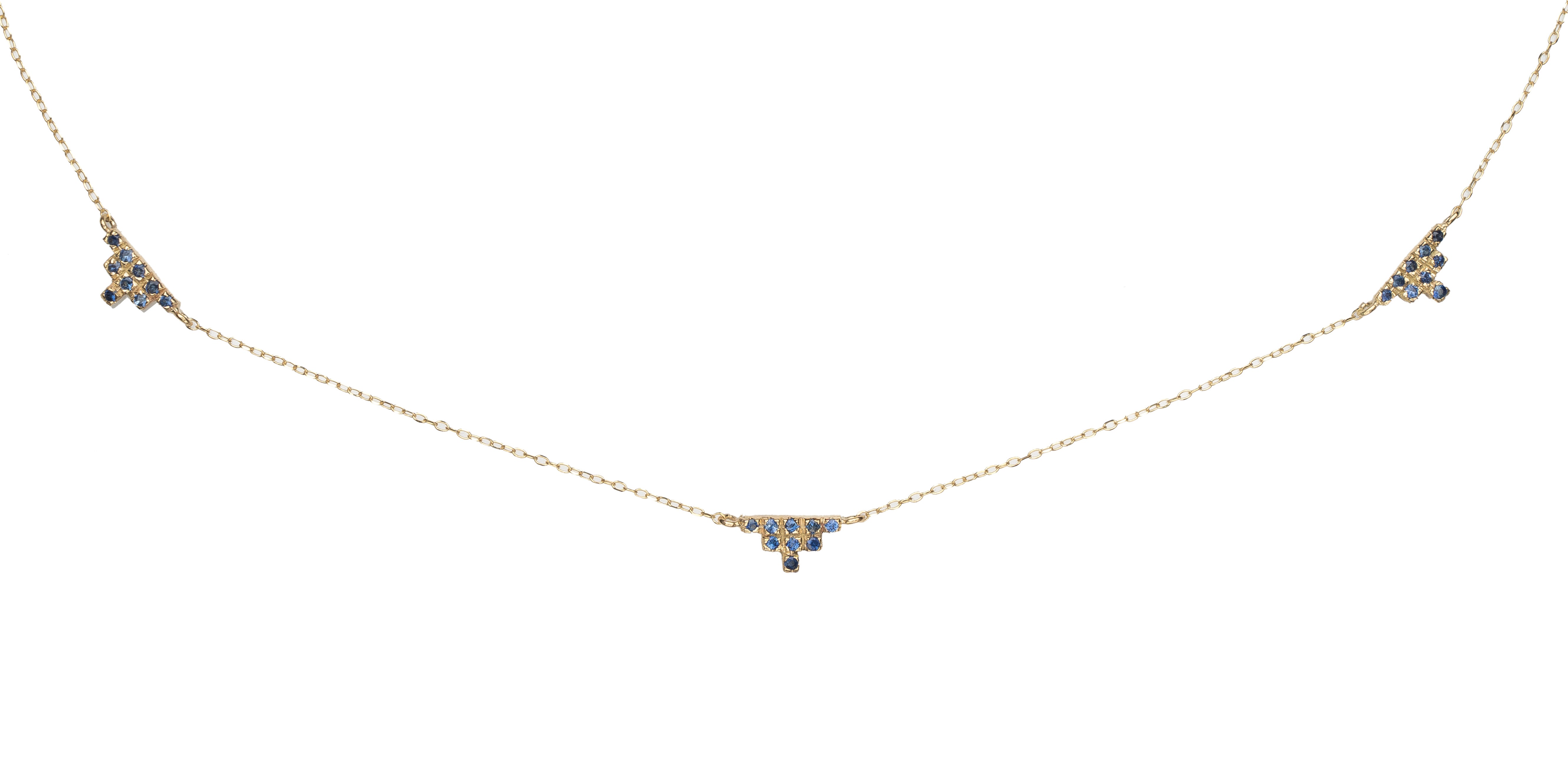 Golden K14 pave necklace with 27 blue sapphires 0,189ct. tied with golden forzentina chain.