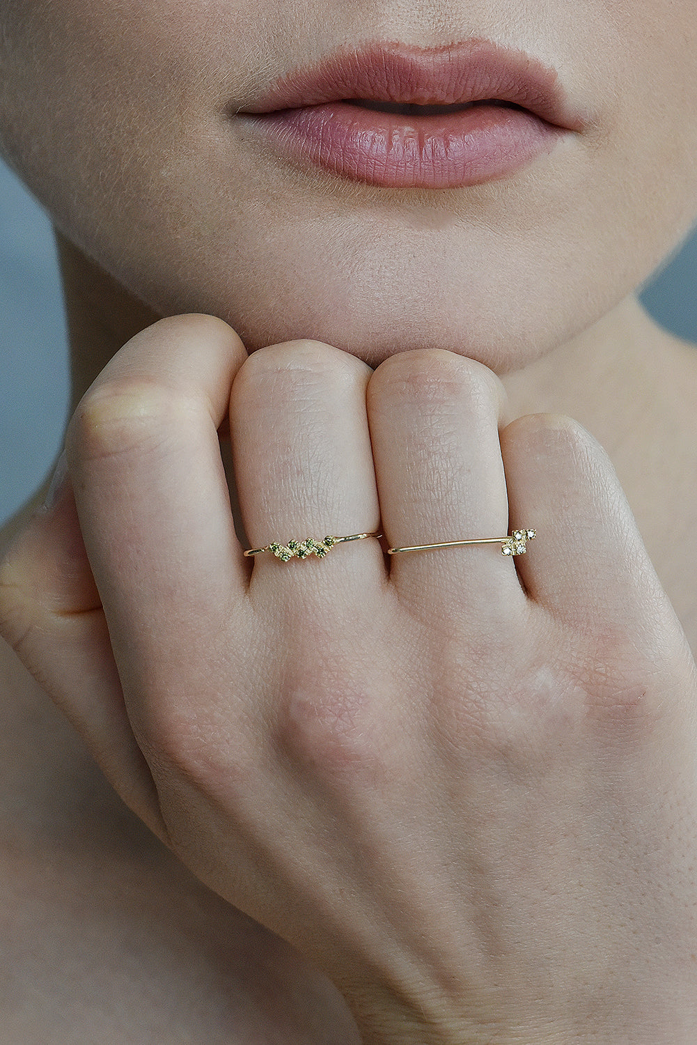 Golden K14 pave ring with 7 green brilliant cut diamonds 0,049ct.