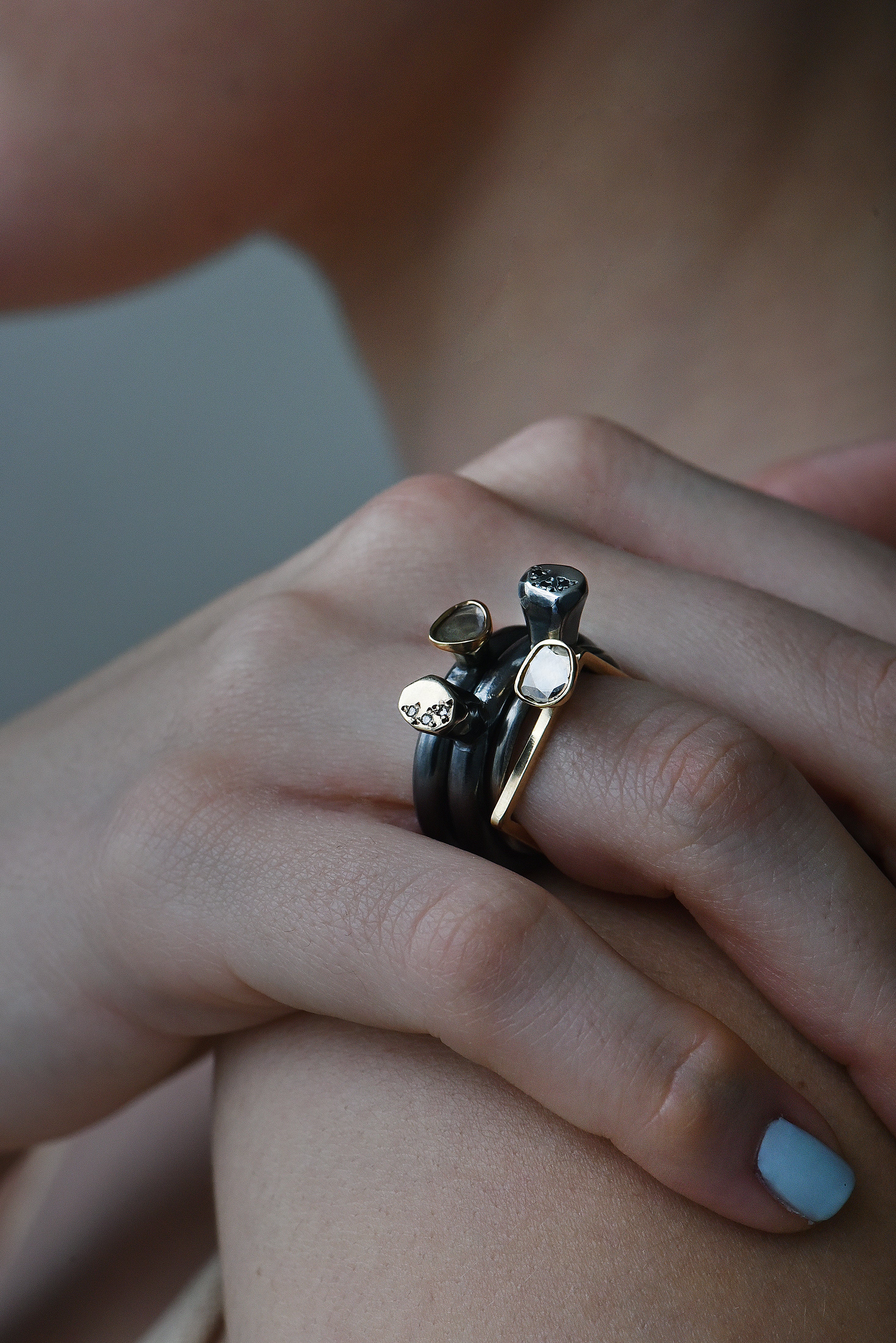Golden K14 square ring with flat cut diamond tied on 18K golden bezel.