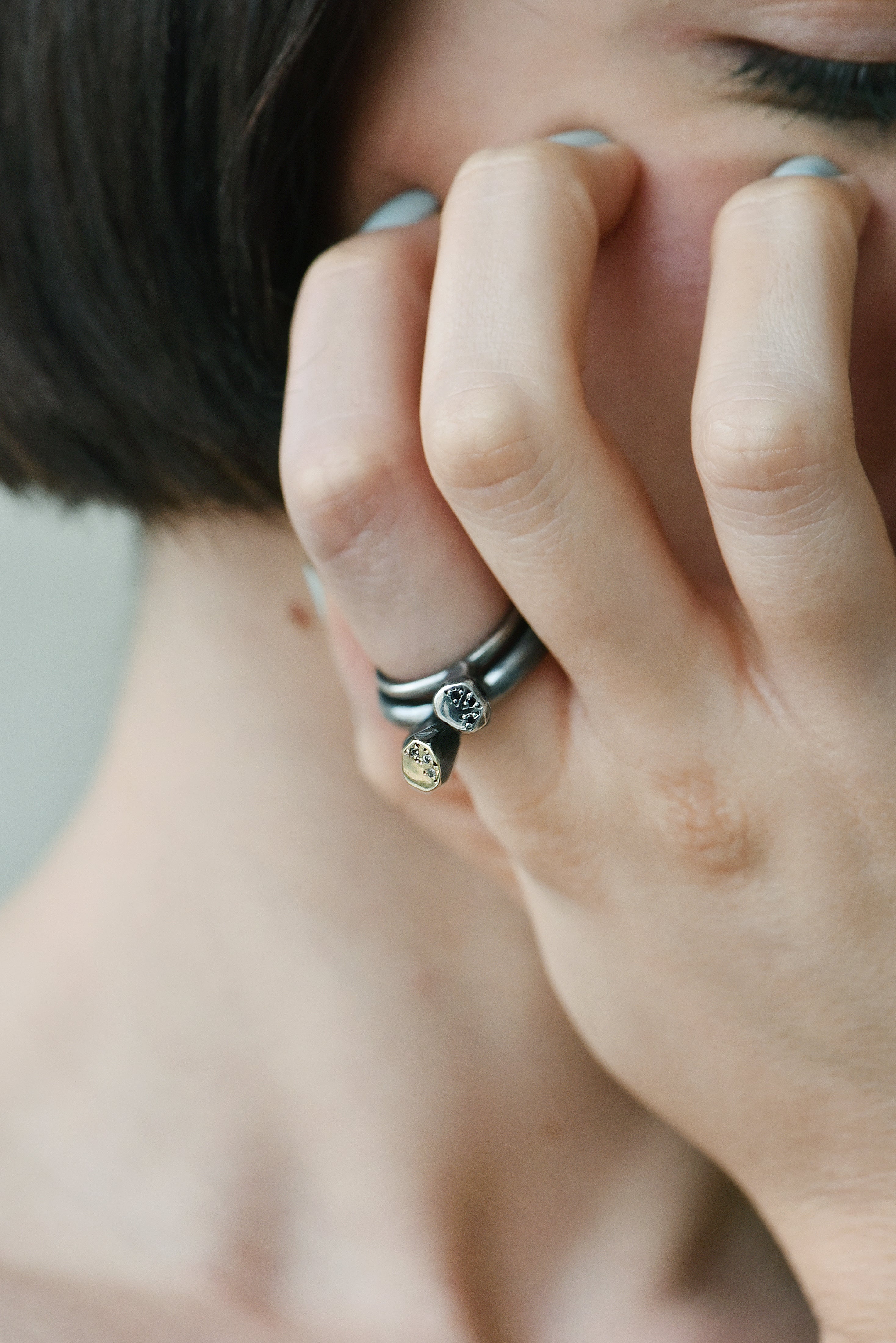 Silver 925 facet ring with a golden K14 leaf and 3 brown brilliant cut diamonds 0,021ct.